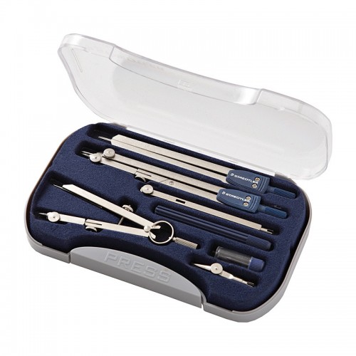 Staedtler 559 09 Arco 7pc Compass Set with hinged leg and needle shoe supports drawing large diameters Max circle 335mm or 433mm with extension arm. Packed in a high quality hard plastic case with transparent lid